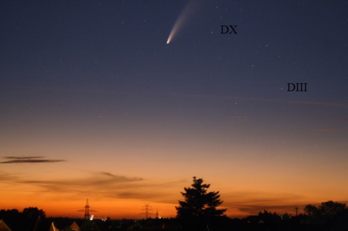 Neowise im Norden über Stade am 13.7.2020 um 0:51 Uhr. Foto Carmesin, Kamera Canon EOS 1000D, Brennweite 75 mm, Belichtungszeit 8 s, 3888 mal 2592 Pixel, Blendenzahl F/0