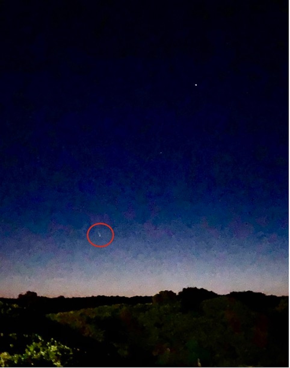 Neowise über Mallorca am 12.7.2020 um 5:17 Uhr. Foto: Marten Machoczek, iphone 10; Belichtungszeit 1/4 s; zweifach gezoomt; 0,3 MP verwendet